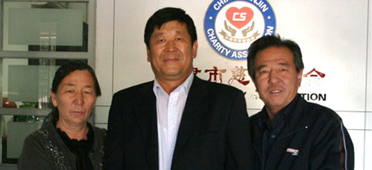 2009安达集团董事长崔洪金为阿依努尔捐款10万元,阿依努尔的母亲、舅舅与董事长崔洪金合影