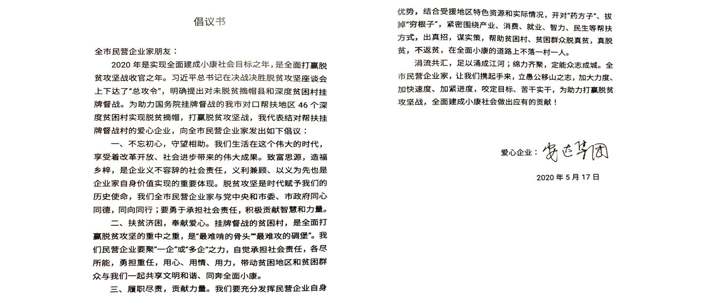 启动仪式上,天津爱心企业以“云聚力”方式发出助力贫困村摘帽行动倡议书,16个区200余家企业进行“云签约”。安达集团作为一家拥有32年历史的优秀企业,在党委书记、董事长崔洪金的带领下,长期坚持慈善公益活动,近年来,响应政府号召,特别关注脱贫攻坚助困工作,通过捐资捐款、购买扶贫产品等方式助力脱贫攻坚工作,今后安达集团还将继续发挥民营企业自身优势,紧密围绕产业、消费、就业、民生等帮扶方式,助力贫困村、贫困群众真脱贫。