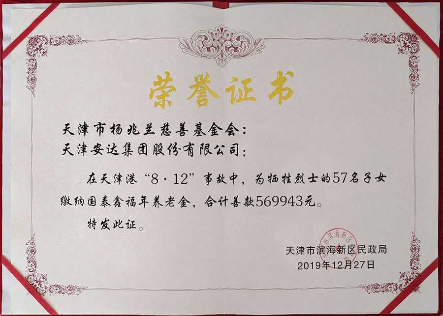 2015年天津市杨兆兰慈善基金会、天津安达集团捐款,为在天津港“8.12”事故中,不幸牺牲烈士的57名子女通过人保缴纳国泰鑫福年养老金,合计57万余元。对于安达集团崔洪金董事长的这份暖心善举,滨海新区慈善协会会长张传捷携滨海新区民政局相关领导亲自登门感谢,将这份沉甸甸的奖状送到崔洪金手里,以示表扬和鼓励。