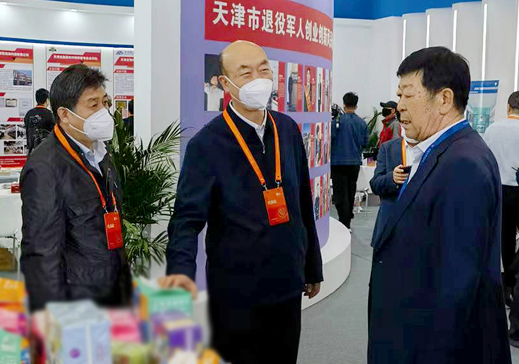 天津市退役军人事务局副局长程建国及相关领导与崔洪金在天津展区进行交流