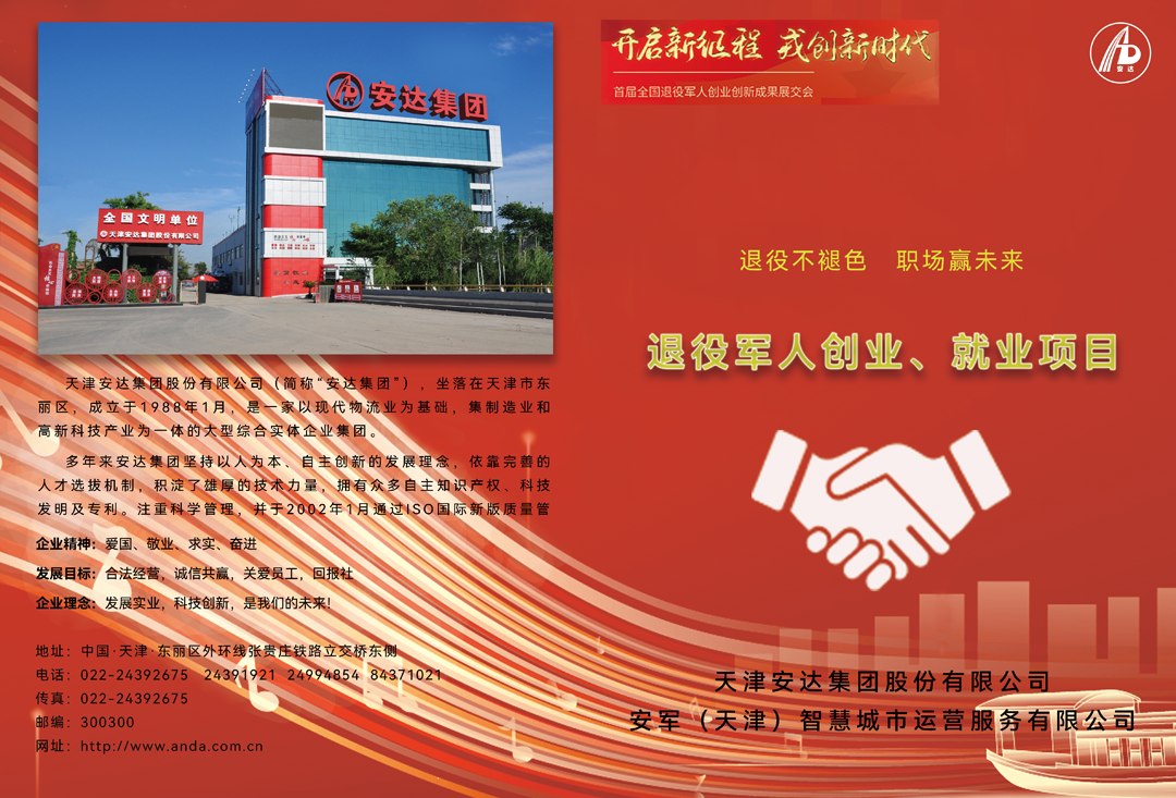 天津安达集团旗下子公司安军(天津)智慧城市运营服务有限公司是一家致力于为专业从事智慧城市科技产品的销售、智慧城市设施的运营与服务的高科技公司,为认真贯彻习近平总书记关于“让军人成为全社会尊崇的职业”的指示精神,更好地配合国务院退役军人事务部开展退役军人创业和就业工作,安达集团以自有的厨余垃圾生化处理设备、机动车和非机动车停车管理系统为内容搭建安达退役军人创业就业平台,为全国退役军人提供项目合作机会,诚挚邀请合伙人加盟项目,共创厨余垃圾就地资源化处理、城市机动车和非机动车的停车管理服务等项目的民生大业。