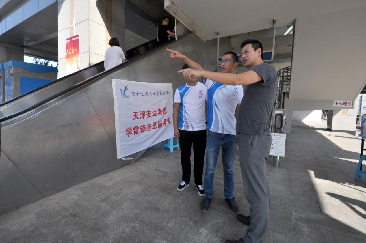 安达集团"迎全运做文明有礼天津人"学雷锋志愿服务岗的志愿者全线上岗服务。身着统一服装的志愿者以良好的精神风貌和娴熟的服务技能,热心为本地市民和到东丽区观赛游览的客人提供临时休息、指路、饮水、借还雨伞等相关便民服务以及全运会东丽赛区赛程咨询等。